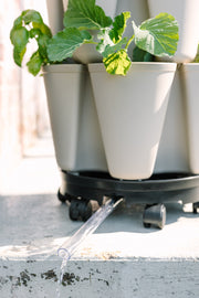 Ensure all of your plants get equal sunlight with GreenStalks patented rotating wheeled planter base proudly made in East Tennessee. Designed for any planter with a base diameter of up to 15 inches, this rotating planter caddy can be used indoors or outdoors on a level surface. It allows for excess water to easily drain through the spout so your plants receive the perfect amount of water every time. Experience the joy of containerized gardening for yourself with the GreenStalk Ultimate Spinner Base, complete with a wheel kit!